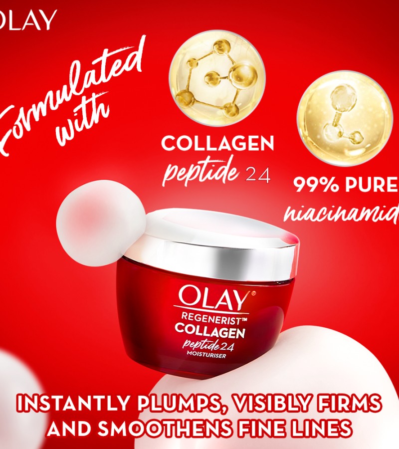 Plump & Bouncy Skin all day long. Olay’s Unique technology Collagen Peptide 24 penetrates^ better into the skin. Regular collagen have larger molecules that couldn’t penetrate into the skin. Olay’s Collagen Peptide is a smaller molecule, hence it penetrates^ better into the skin.
