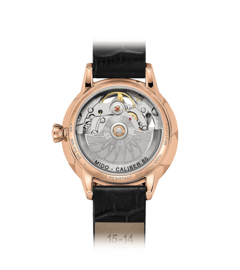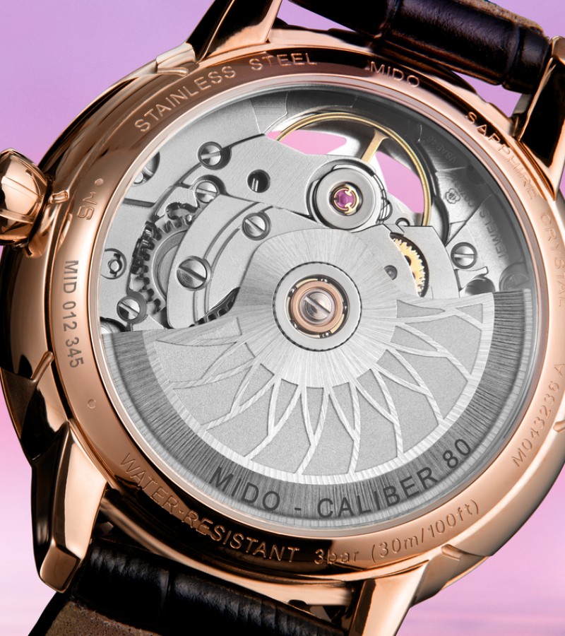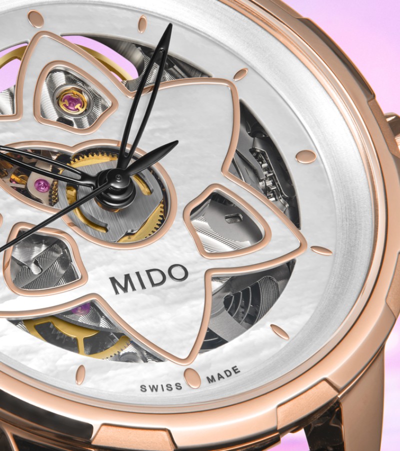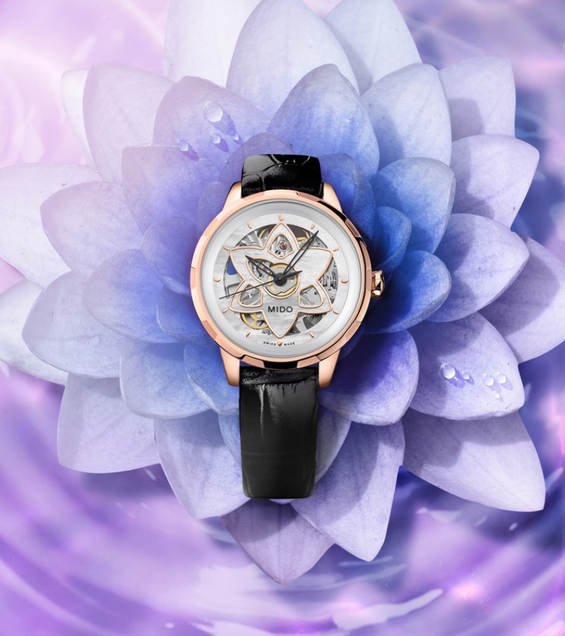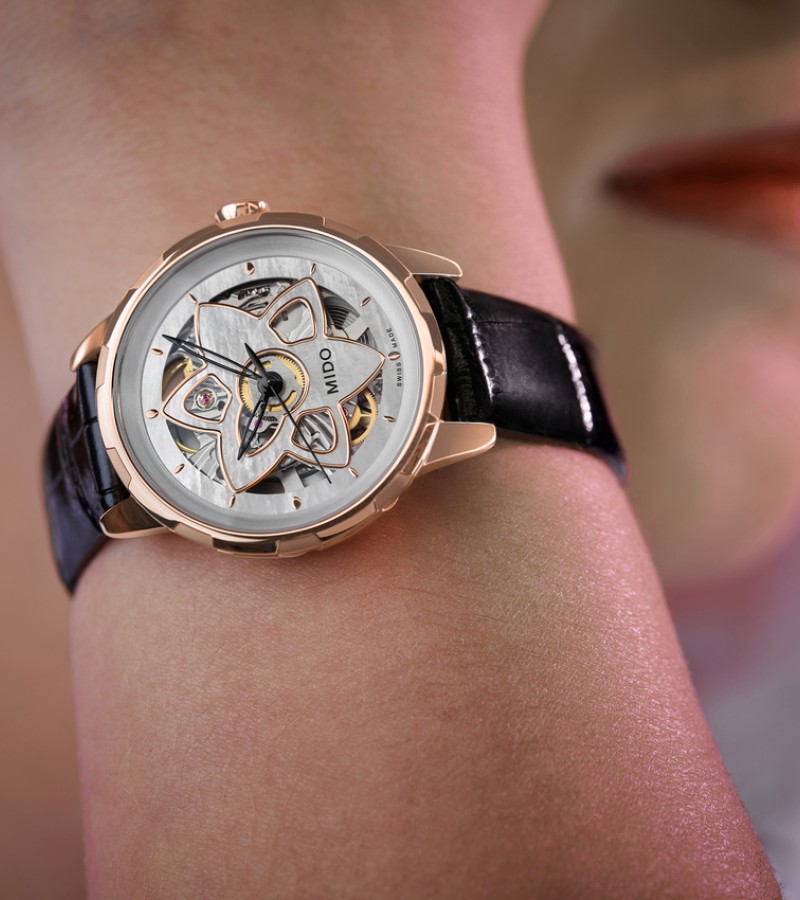 For the first time, Mido has created a skeleton Swiss watch especially dedicated to women. The new and audacious Rainflower Blossom features delicate lines, directly inspired by the lotus flower shape of Singapore’s contemporary ArtScience Museum. Resolutely feminine petals are interlaced along the edges. Adorned with an openwork flower, the captivating dial reveals at its centre the Caliber 80 – the latest-generation automatic movement, whose mainplate has been specially skeletonised and decorated. It invites the wearer to marvel at the passing of time with audacityand elegance.