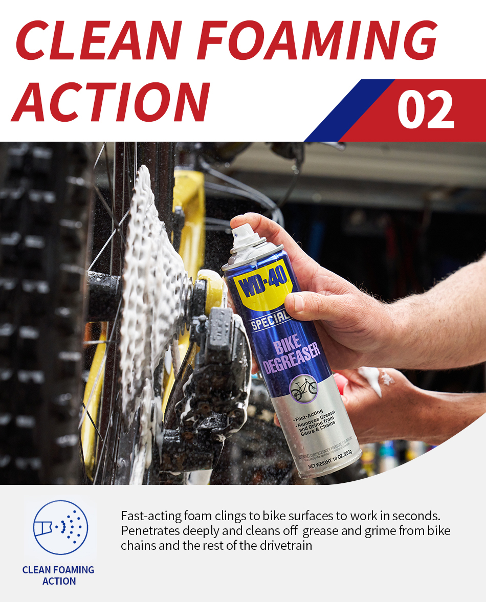 WD-40 Specialist® Bike Degreaser foaming action clings to chain, cogs and gears to deeply penetrate and remove stubborn grease and grime from all moving parts. Experience the difference of a fast-acting professional grade formula that removes dirt, mud & grime.