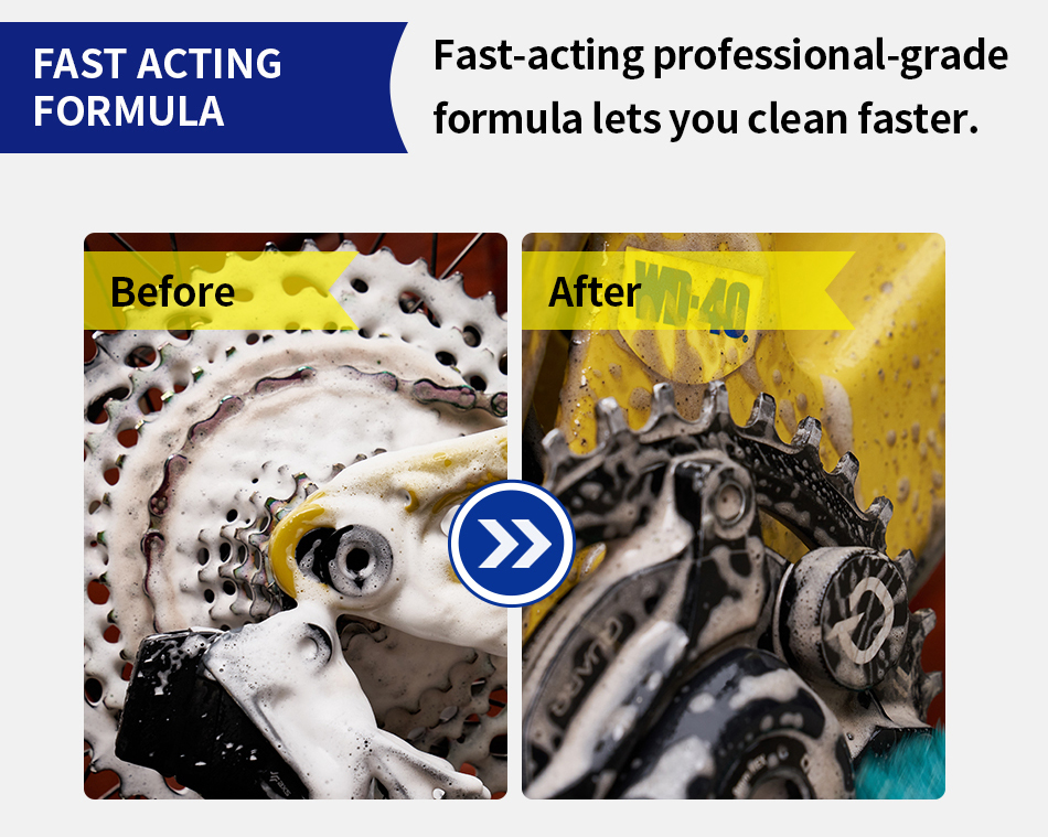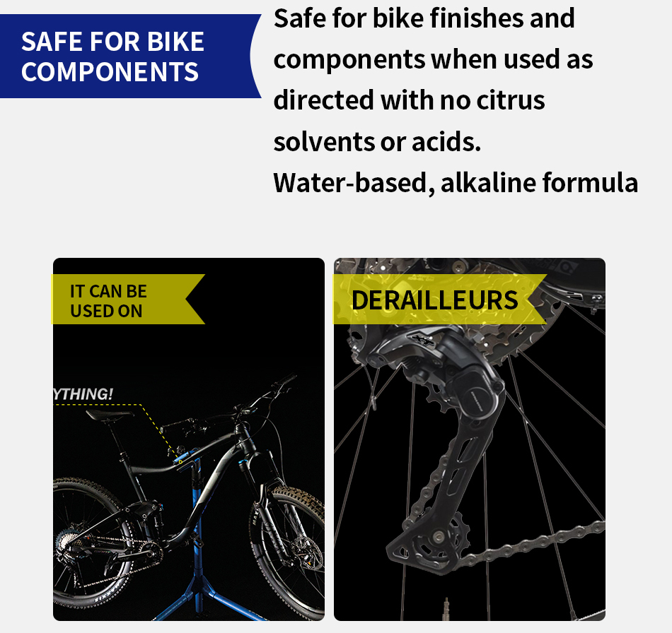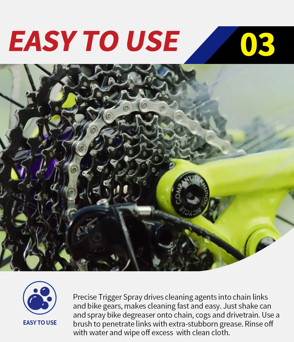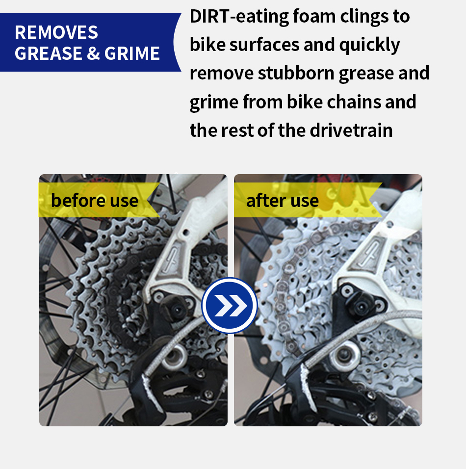 Fast-acting foam clings to surfaces to work in seconds. Safe for bike finishes and components with no citrus solvents or acids. Easy to use, precision spray drives cleaning agents into chain links.