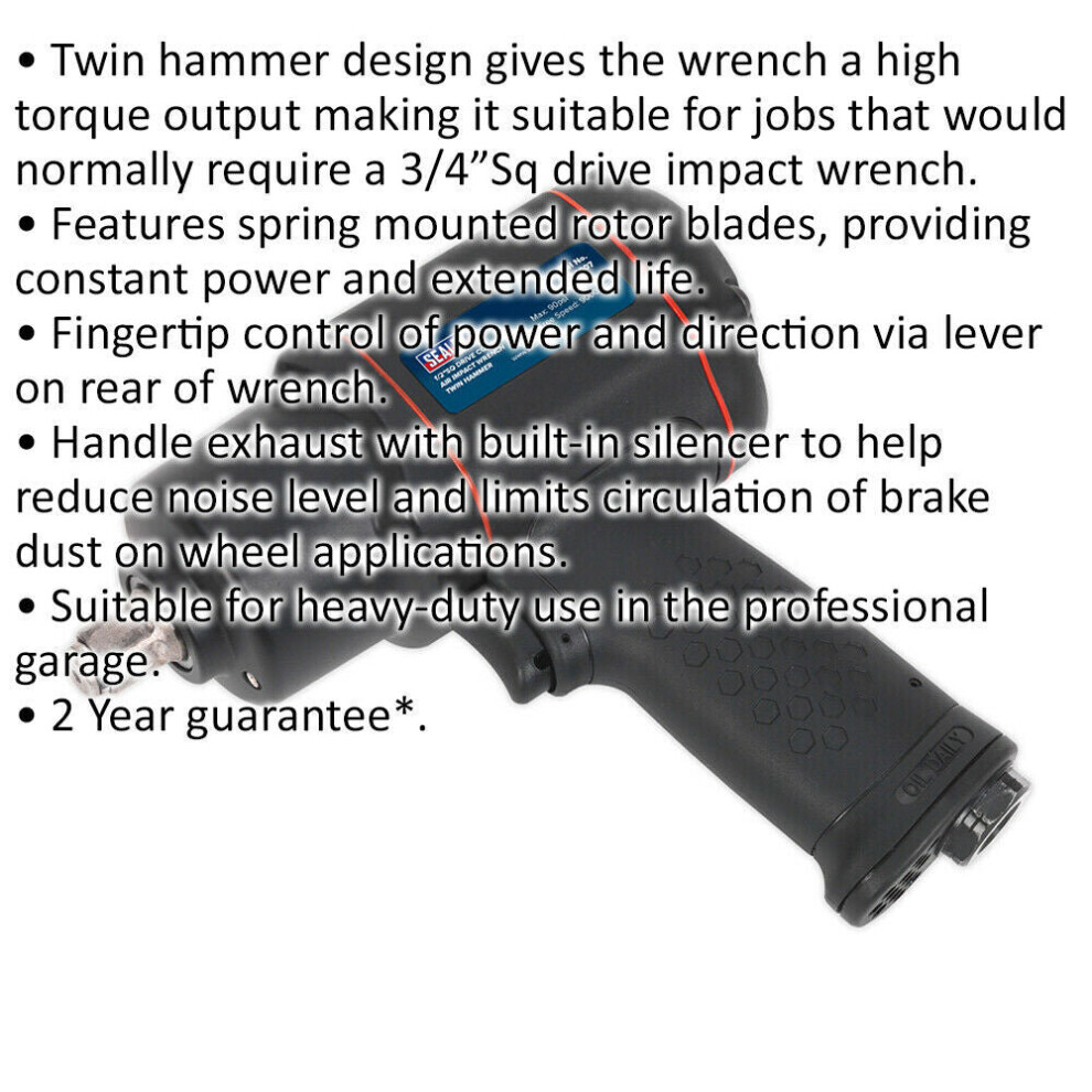 Twin hammer design gives the wrench a high torque output making it suitable for jobs that would normally require a 3/4"Sq drive impact wrench. Features spring mounted rotor blades, providing constant power and extended life. Fingertip control of power and direction via lever on rear of wrench. Handle exhaust with built-in silencer to help reduce noise level and limits circulation of brake dust on wheel applications. Suitable for heavy-duty use in the professional garage.
